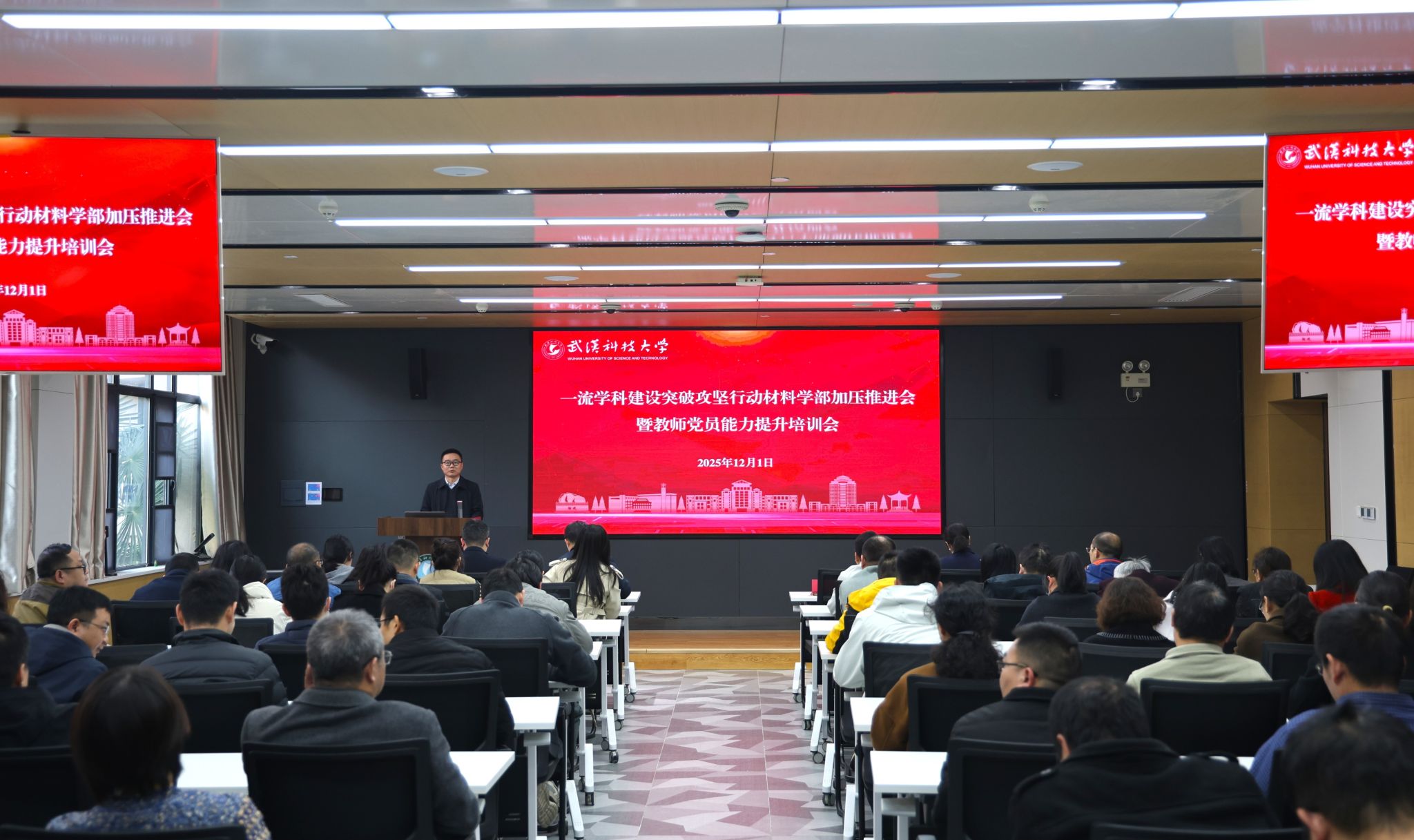 武科大网讯(通讯员 彭九九 叶显伟)12月1日下午,我部在青山校区图书馆路演厅召开“一流学科建设突破攻坚行动加压推进会暨教师党员能力提升培训会”。会议全面贯彻落实湖北省关于推进省属高校“双一流”建设工作和学校一流学科建设领导小组会议精神,系统总结了学部2025年工作成效,全面部署了一流学科建设重点任务,研究谋划了明年的工作安排,同时深入开展党纪党史学习教育。学部执行主任李享成及全体在家领导班子成员出席会议。会议由学部党委书记刘帅主持。