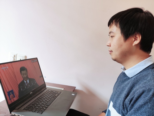 图6:“中国大学生自强之星”材冶学院博士胡晓明收看二十大开幕会