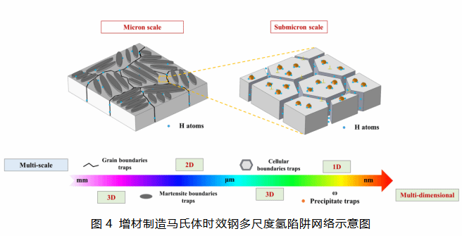 针对超高强马氏体时效钢研发和应用时面临的强度-氢脆抗力失配这一瓶颈问题。团队通过系统研究提出了利用增材制造技术优势来研发超高强抗氢脆马氏体时效钢的新思路,发展出新型长时低温热处理技术构筑多尺度氢陷阱网络和多重强韧化微结构,首次实现了马氏体时效钢强度和抗氢脆性能的协同改善,并澄清其改善机理。相关成果发表在材料腐蚀领域顶刊Corrosion Science,223(2023):111440.(IF: 8.3)。刘静教授为论文通讯作者,张施琦副教授为第一作者。