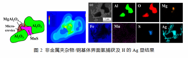针对钢中最小原子H的原位、直观、快速表征难题,团队发明了原位氢显、微区氢渗透、氢分布/逸出快速表征检测技术,实现了钢中复合夹杂物界面氢扩散/捕获、单颗夹杂饱和氢捕获量、夹杂物界面氢逸出原位、实时、快速检测。率先揭示了钢中氢陷阱效应的微区界面应力机制,并据此创新性设计了微纳“Mg/Al/Ti等氧化物硬核-Mn/Ca等硫化物软壳”构型夹杂物,开发了改进的第三代氧化物冶金微Mg处理技术进行上述夹杂物精准控制,实现我国70级高强度海底厚板管线钢从0到1的突破。研究成果发表在材料腐蚀领域顶刊Corrosion Science, 195(2022)110006. (IF: 8.3) 。材料学部黄峰教授为论文通讯作者,博士生肖虎为第一作者。