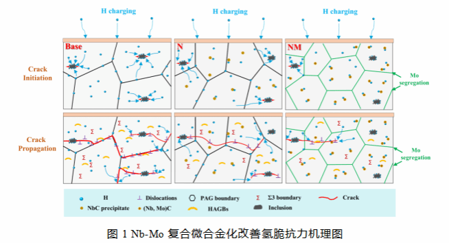 利用管道长距离跨地区输氢是实现氢能大规模应用的有效途径。然而,管道在临氢环境下常面临氢脆问题。针对该挑战,团队提出利用Nb-Mo复合微合金化技术协同调控深氢陷阱的新路径,研发出复合纳米相与晶界偏聚协同改性的抗氢脆管线钢,实现氢脆抗力大幅提升,为未来输氢管线钢的设计提供了新启示。成果发表于金属材料顶刊Journal of Materials Science & Technology,2023, 158: 156-170.(IF: 10.9)。材料学部刘静教授为论文通讯作者,张施琦副教授为第一作者。