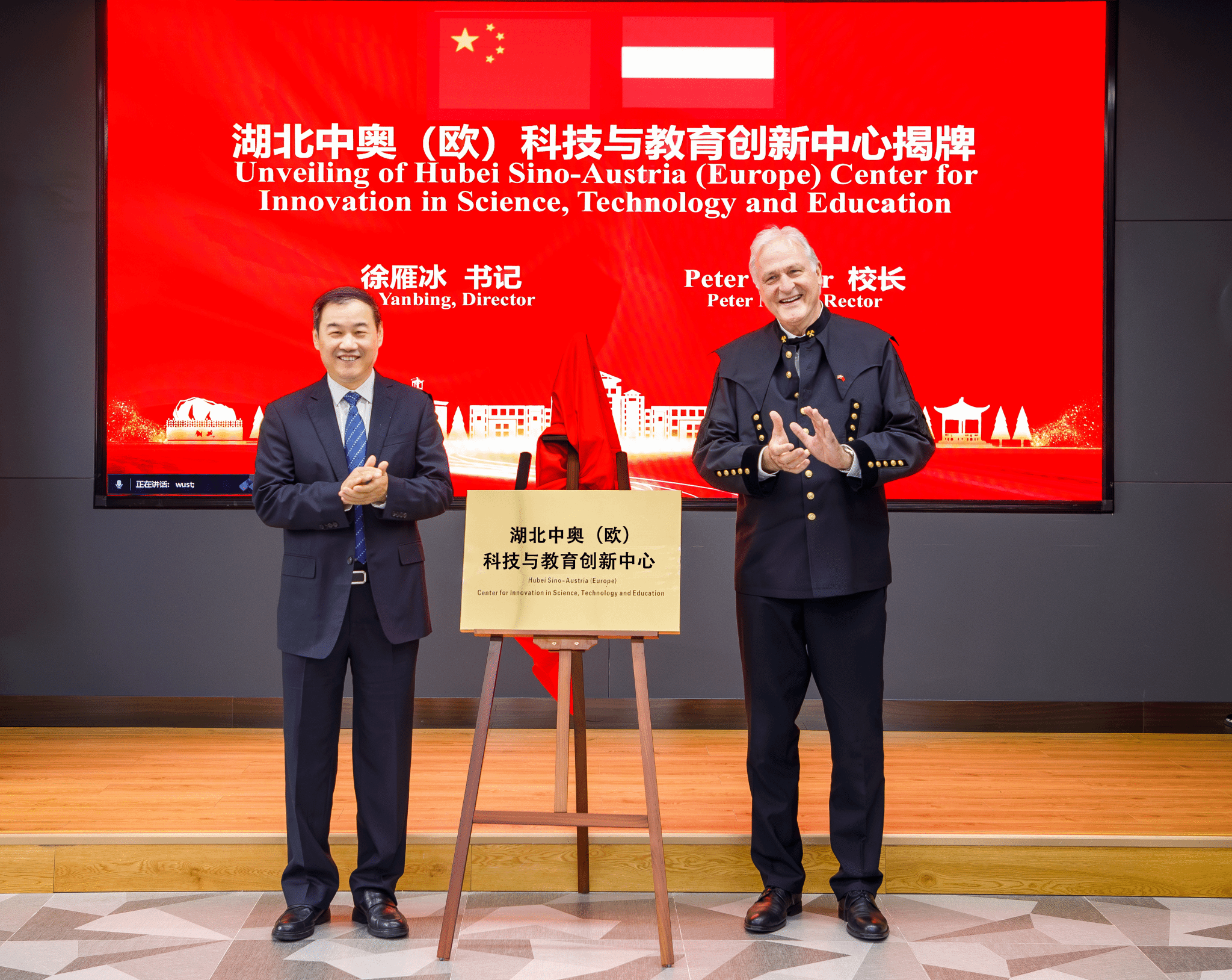 徐雁冰、Peter Moster共同为“湖北中奥(欧)科技与教育创新中心”揭牌。倪红卫代表学校与莱奥本矿业大学、K1-MET中心分别签署了合作协议。
