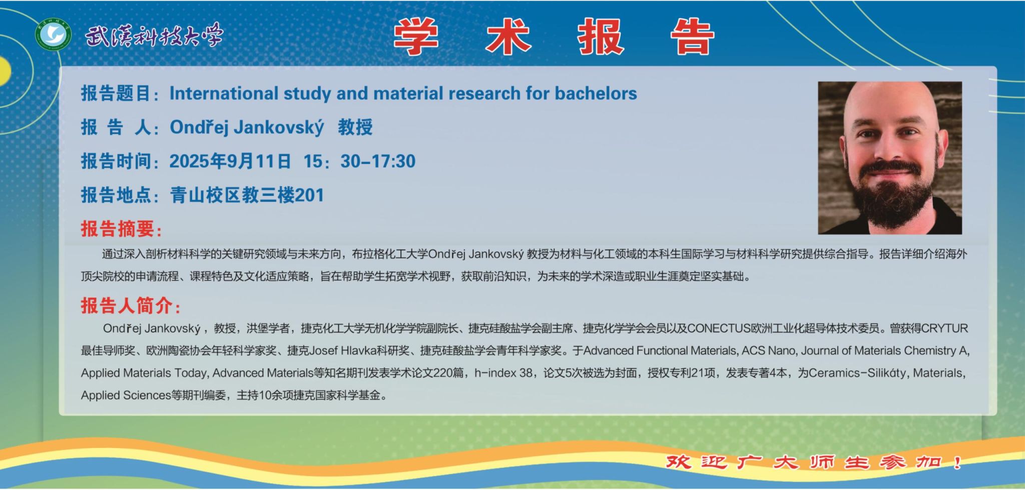 通过深入剖析材料科学的关键研究领域与未来方向,布拉格化工大学Ondřej Jankovský教授为材料与化工领域的本科生国际学习与材料科学研究提供综合指导。报告详细介绍海外顶尖院校的申请流程、课程特色及文化适应策略,旨在帮助学生拓宽学术视野,获取前沿知识,为未来的学术深造或职业生涯奠定坚实基础。
