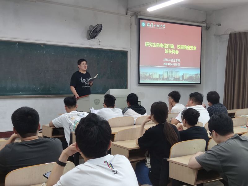 武科大网讯(通讯员祁麟)为进一步强化研究生安全教育,加强防电信诈骗宣传力度,学院于4月19日中午在主楼0101举行了研究生防电信诈骗、校园宿舍安全的班长例会。