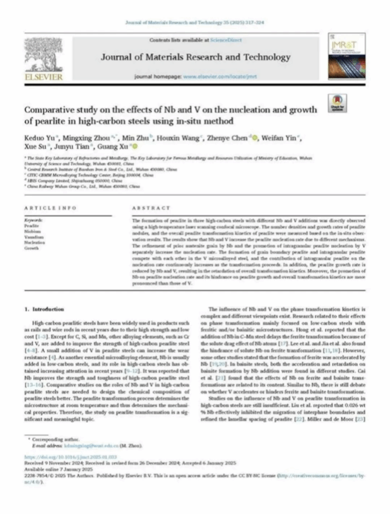 余可多作为第一作者在材料科学领域国际重要学术期刊《Journal of Materials Research and Technology》发表了题为《Comparative study on the effects of Nb and V on the nucleation and growth of pearlite in high-carbon steels using in-situ method》的高水平论文。