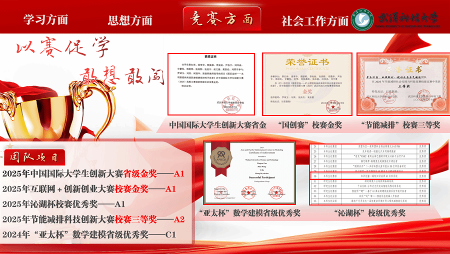 学术竞赛:获得中国国际大学生创新大赛省级金奖,节能减排科技创新大赛校级三等奖,“亚太杯”数学建模大赛省级优秀奖。发表发明专利1篇(已受理)。