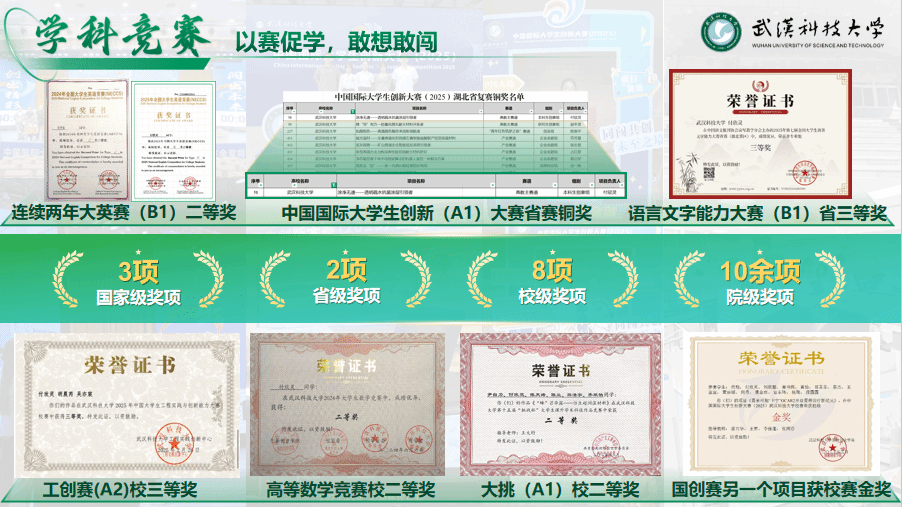 学术竞赛:立项省级大创项目1项,获得中国国际大学生创新大赛省赛铜奖,全国大学生英语竞赛二等奖,语言文字能力大赛省级三等奖,高等数学竞赛校级二等奖等。累计获得国家级奖项3项,省级奖项2项,校级奖项8项。