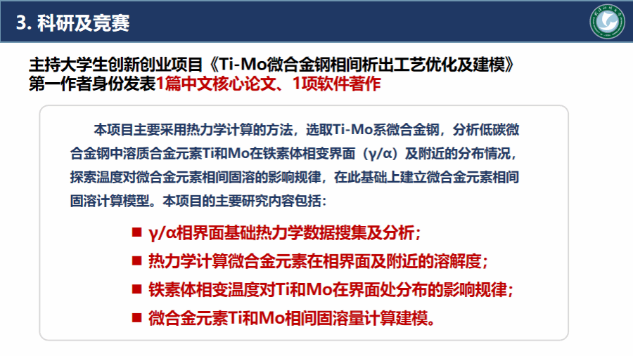 学术竞赛:参与《多强度级别低合金高强钢加热工艺的优化》科研项目,参与发表中文核心期刊论文1篇。