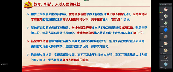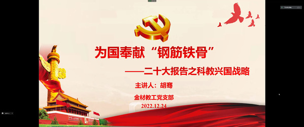 武科大网讯 根据学校“二十大精神宣讲团”统一部署,12月24日,材料与冶金学院金材教工党支部书记胡骞在线上为金材系42名研究生作了题为“为国奉献‘钢筋铁骨’——二十大报告之科教兴国战略”的报告。