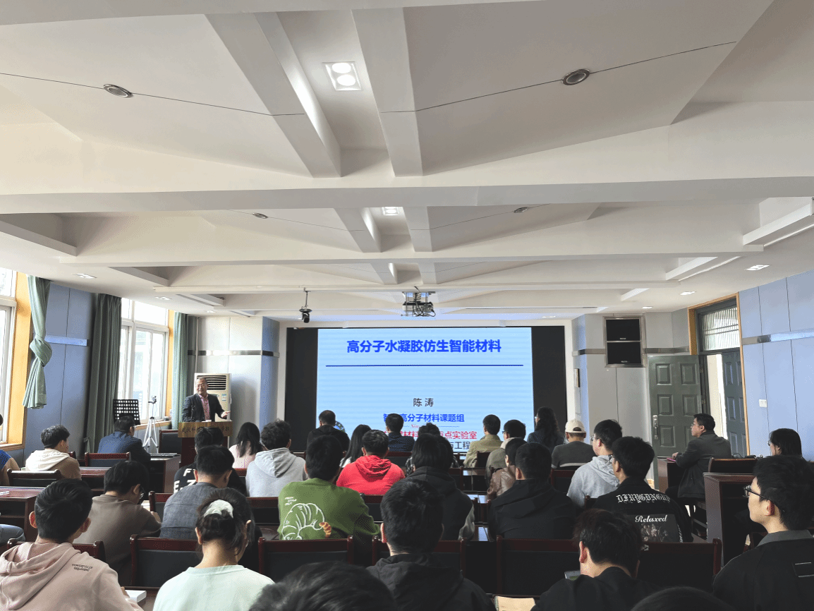 交流环节中,师生就高分子水凝胶在形变色变、吸湿制水、信息存储等前沿应用踊跃提问,陈涛逐一细致解答。