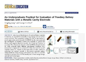 近日,美国化学会旗下化学教育领域期刊《Journal of Chemical Education》(JCE)以封面论文形式发表了我校材料学部材料化学系的重要教学研究成果“An Undergraduate Practical for Evaluation of Powdery Battery Materials with a Metallic Cavity Electrode”(J. Chem. Educ. 2024, 101, 4995-5002)。这是材料学部首次在JCE发表教研论文并获选封面。JCE创刊于1924年,是全球化学教育领域最具影响力的SCI期刊之一,该成果的发表凸显本项研究的创新价值与教学实践意义,标志着学部教研论文在国际教育类顶级期刊零的突破。